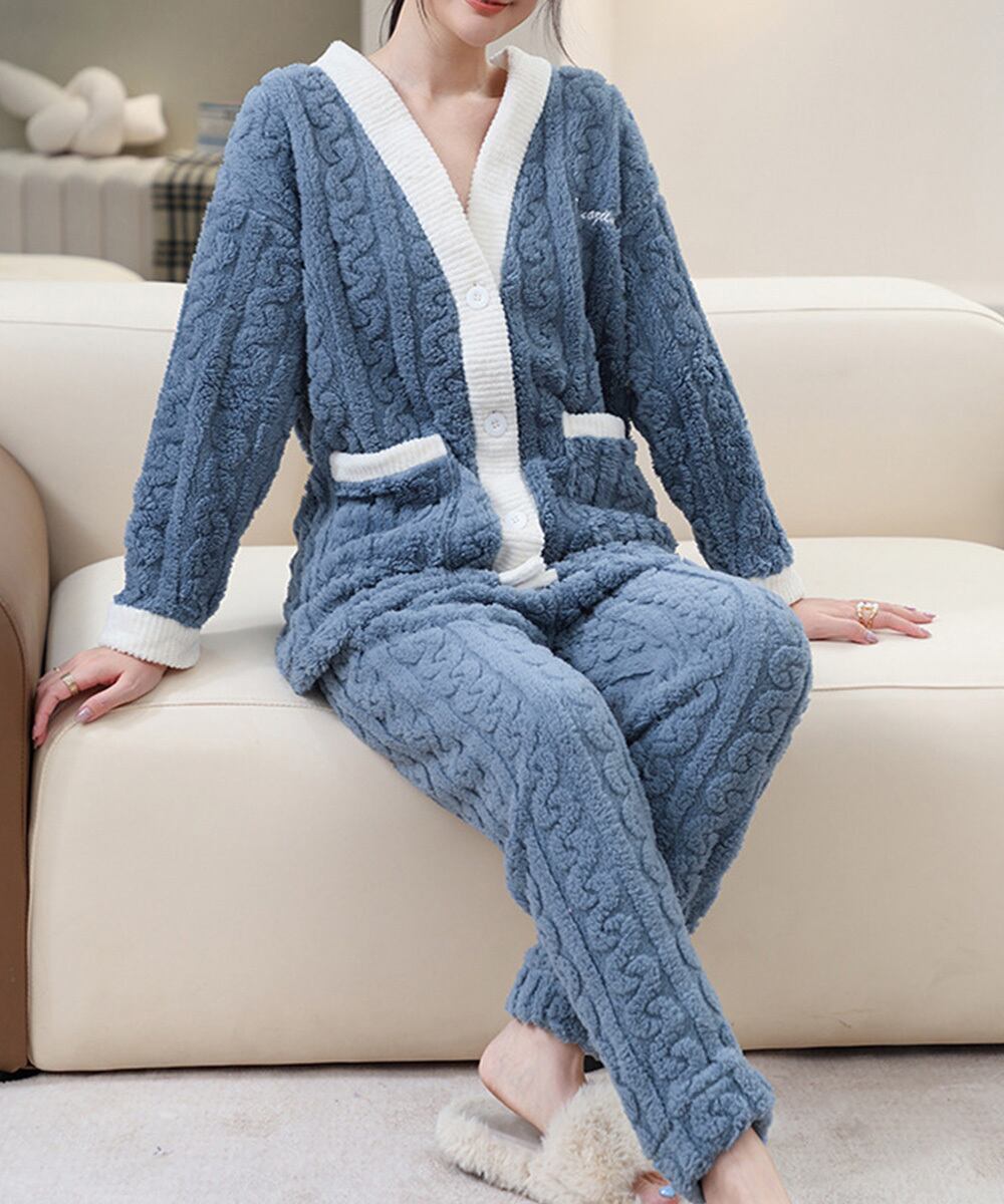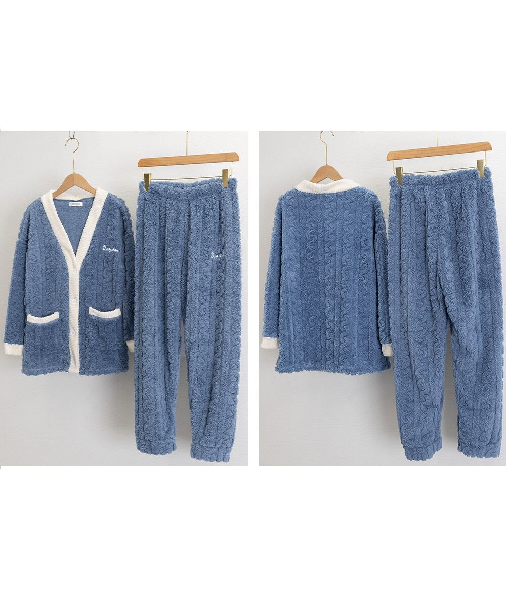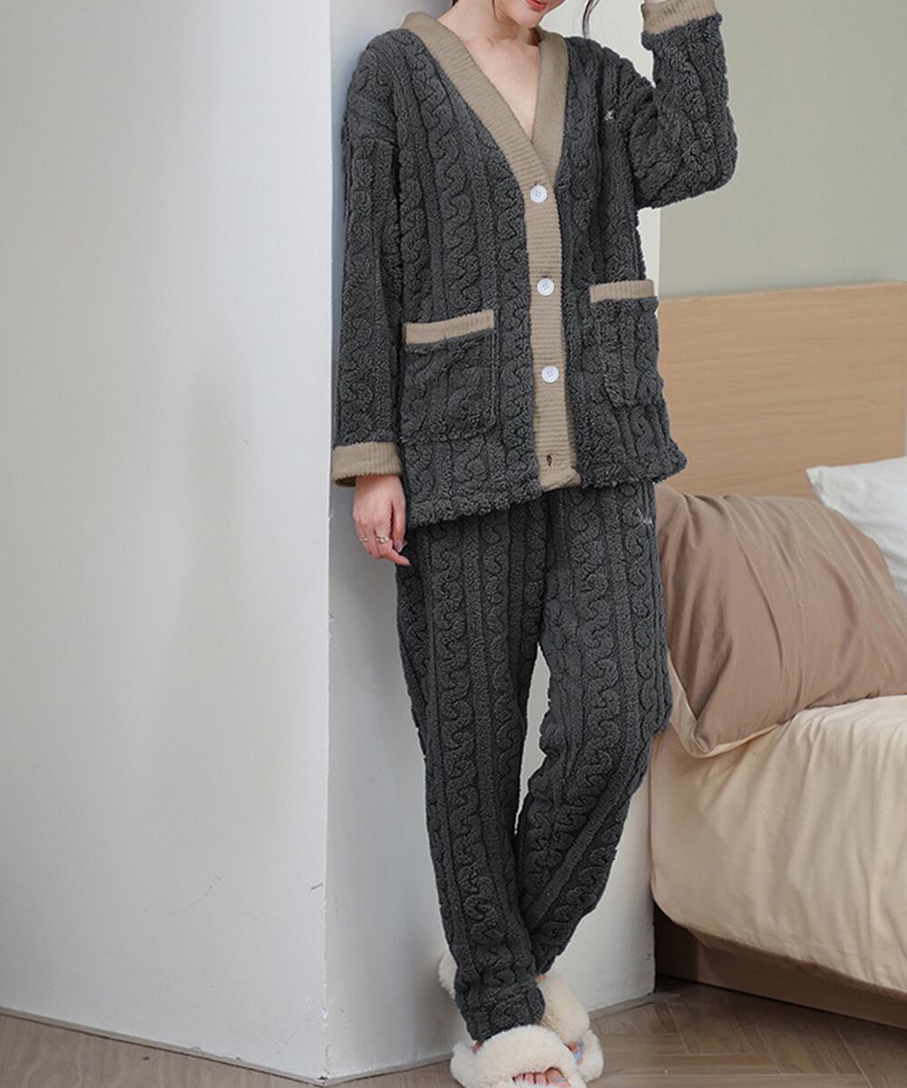 大人可愛い もこもこ部屋着 ケーブル柄 ルームウェアセットアップ 秋冬 ふわふわナイトウェア 軽く暖かい 厚手長袖寝巻き